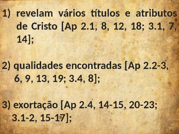 - revelam vários títulos e atributos de Cristo [Ap 2.1, 8, 12, 18; 3.1, 7, 14];2) qualidades encontradas [Ap 2.2-3, 6, 9, 13, 19; 3.4, 8];3) exortação [Ap 2.4, 14-15, 20-23; 3.1-2, 15-17];