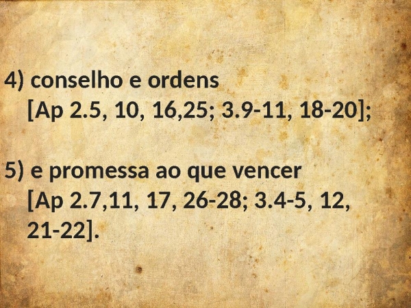 - 4) conselho e ordens [Ap 2.5, 10, 16,25; 3.9-11, 18-20];5) e promessa ao que vencer [Ap 2.7,11, 17, 26-28; 3.4-5, 12, 21-22].