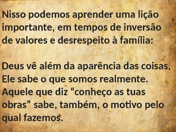 - Nisso podemos aprender uma lição importante, em tempos de inversão de valores e desrespeito à família: Deus vê além da aparência das coisas, Ele sabe o que somos realmente. Aquele que diz “conheço as tuas obras” sabe, também, o motivo pelo qual fazemos.