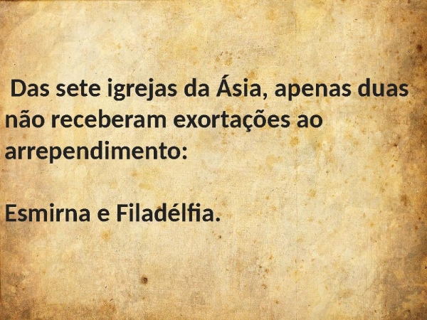 - Das sete igrejas da Ásia, apenas duas não receberam exortações ao arrependimento: Esmirna e Filadélfia.