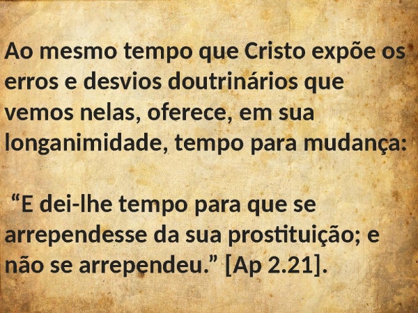 - Ao mesmo tempo que Cristo expõe os erros e desvios doutrinários que vemos nelas, oferece, em sua longanimidade, tempo para mudança: “E dei-lhe tempo para que se arrependesse da sua prostituição; e não se arrependeu.” [Ap 2.21].
