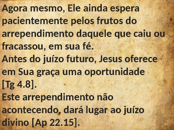 - Agora mesmo, Ele ainda espera pacientemente pelos frutos do arrependimento daquele que caiu ou fracassou, em sua fé. Antes do juízo futuro, Jesus oferece em Sua graça uma oportunidade [Tg 4.8].Este arrependimento não acontecendo, dará lugar ao juízo divino [Ap 22.15].