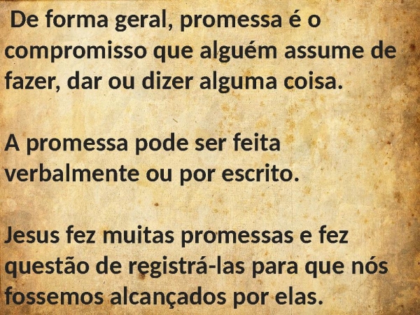 - De forma geral, promessa é o compromisso que alguém assume de fazer, dar ou dizer alguma coisa.A promessa pode ser feita verbalmente ou por escrito.Jesus fez muitas promessas e fez questão de registrá-las para que nós fossemos alcançados por elas.