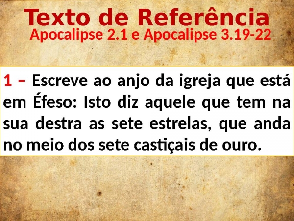 - Texto de Referência Apocalipse 2.1 e Apocalipse 3.19-221 – Escreve ao anjo da igreja que está em Éfeso: Isto diz aquele que tem na sua destra as sete estrelas, que anda no meio dos sete castiçais de ouro.