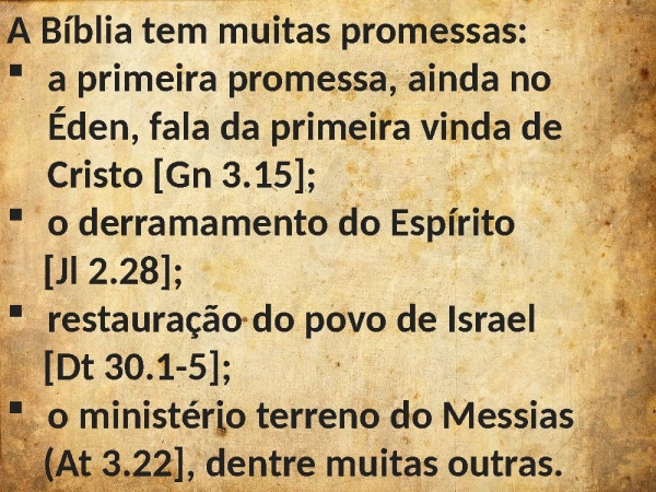 - A Bíblia tem muitas promessas:a primeira promessa, ainda no Éden, fala da primeira vinda de Cristo [Gn 3.15];o derramamento do Espírito [Jl 2.28];restauração do povo de Israel [Dt 30.1-5];o ministério terreno do Messias (At 3.22], dentre muitas outras.