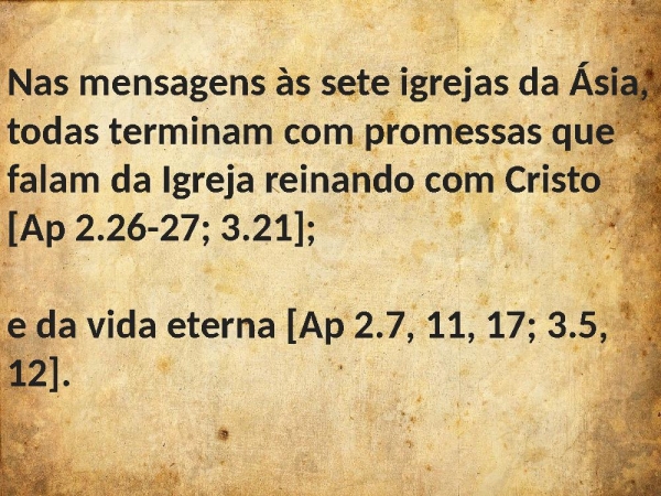 - Nas mensagens às sete igrejas da Ásia, todas terminam com promessas que falam da Igreja reinando com Cristo [Ap 2.26-27; 3.21];e da vida eterna [Ap 2.7, 11, 17; 3.5, 12].