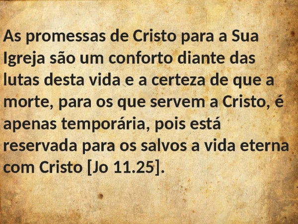 - As promessas de Cristo para a Sua Igreja são um conforto diante das lutas desta vida e a certeza de que a morte, para os que servem a Cristo, é apenas temporária, pois está reservada para os salvos a vida eterna com Cristo [Jo 11.25].