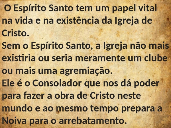 - O Espírito Santo tem um papel vital na vida e na existência da Igreja de Cristo. Sem o Espírito Santo, a Igreja não mais existiria ou seria meramente um clube ou mais uma agremiação. Ele é o Consolador que nos dá poder para fazer a obra de Cristo neste mundo e ao mesmo tempo prepara a Noiva para o arrebatamento.