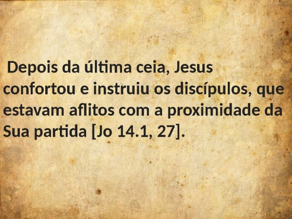 - Depois da última ceia, Jesus confortou e instruiu os discípulos, que estavam aflitos com a proximidade da Sua partida [Jo 14.1, 27].