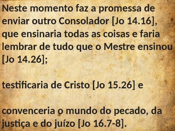 - Neste momento faz a promessa de enviar outro Consolador [Jo 14.16], que ensinaria todas as coisas e faria lembrar de tudo que o Mestre ensinou [Jo 14.26];testificaria de Cristo [Jo 15.26] e convenceria o mundo do pecado, da justiça e do juízo [Jo 16.7-8].