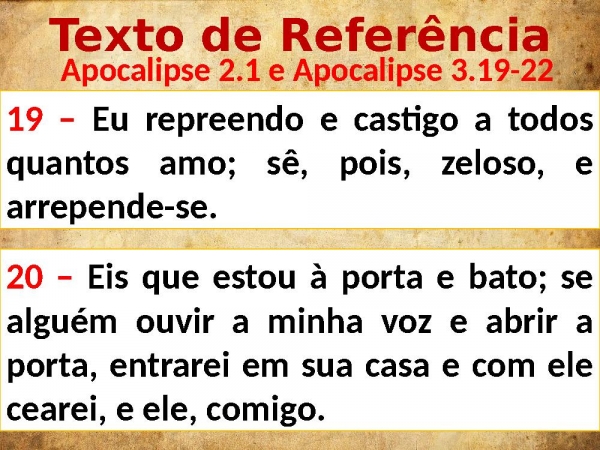 - Texto de Referência Apocalipse 2.1 e Apocalipse 3.19-2219 – Eu repreendo e castigo a todos quantos amo; sê, pois, zeloso, e arrepende-se.20 – Eis que estou à porta e bato; se alguém ouvir a minha voz e abrir a porta, entrarei em sua casa e com ele cearei, e ele, comigo.