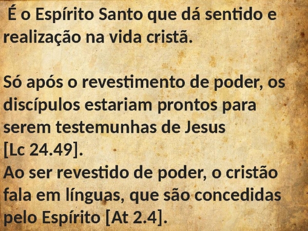 - É o Espírito Santo que dá sentido e realização na vida cristã. Só após o revestimento de poder, os discípulos estariam prontos para serem testemunhas de Jesus [Lc 24.49].Ao ser revestido de poder, o cristão fala em línguas, que são concedidas pelo Espírito [At 2.4].