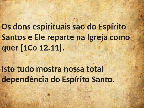 - Os dons espirituais são do Espírito Santos e Ele reparte na Igreja como quer [1Co 12.11]. Isto tudo mostra nossa total dependência do Espírito Santo.