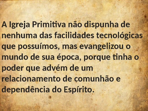 - A Igreja Primitiva não dispunha de nenhuma das facilidades tecnológicas que possuímos, mas evangelizou o mundo de sua época, porque tinha o poder que advém de um relacionamento de comunhão e dependência do Espírito.