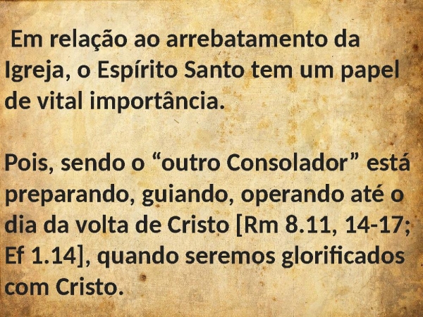 - Em relação ao arrebatamento da Igreja, o Espírito Santo tem um papel de vital importância.Pois, sendo o “outro Consolador” está preparando, guiando, operando até o dia da volta de Cristo [Rm 8.11, 14-17; Ef 1.14], quando seremos glorificados com Cristo.