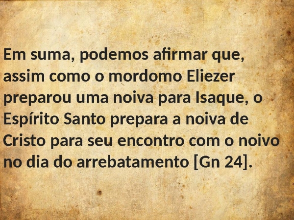 - Em suma, podemos afirmar que, assim como o mordomo Eliezer preparou uma noiva para Isaque, o Espírito Santo prepara a noiva de Cristo para seu encontro com o noivo no dia do arrebatamento [Gn 24].