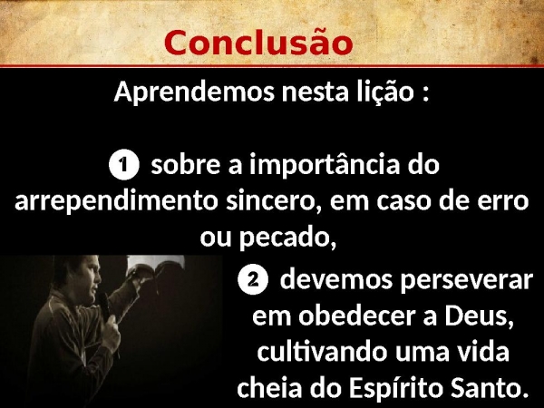 - Conclusão ❷ devemos perseverar em obedecer a Deus, cultivando uma vida cheia do Espírito Santo.Aprendemos nesta lição :❶ sobre a importância do arrependimento sincero, em caso de erro ou pecado,