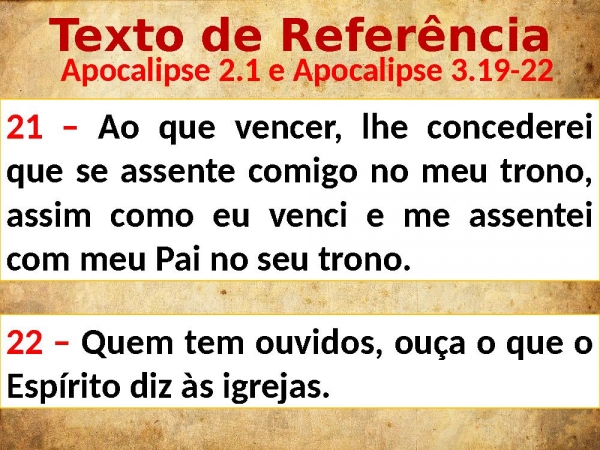 - Texto de Referência Apocalipse 2.1 e Apocalipse 3.19-2221 – Ao que vencer, lhe concederei que se assente comigo no meu trono, assim como eu venci e me assentei com meu Pai no seu trono.22 – Quem tem ouvidos, ouça o que o Espírito diz às igrejas.