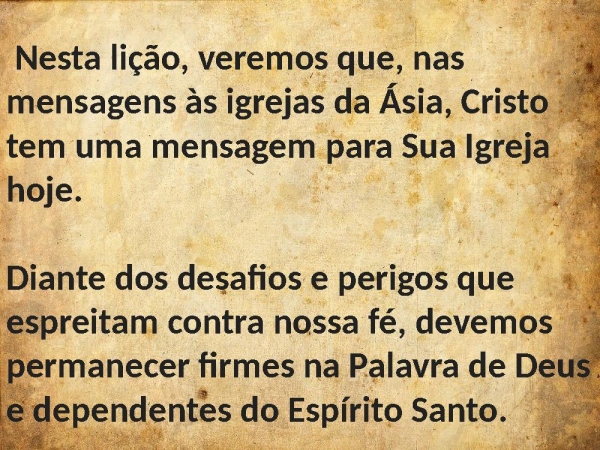 - Nesta lição, veremos que, nas mensagens às igrejas da Ásia, Cristo tem uma mensagem para Sua Igreja hoje.Diante dos desafios e perigos que espreitam contra nossa fé, devemos permanecer firmes na Palavra de Deus e dependentes do Espírito Santo.