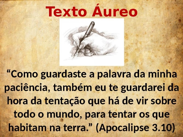 - Texto Áureo“Como guardaste a palavra da minha paciência, também eu te guardarei da hora da tentação que há de vir sobre todo o mundo, para tentar os que habitam na terra.” (Apocalipse 3.10)