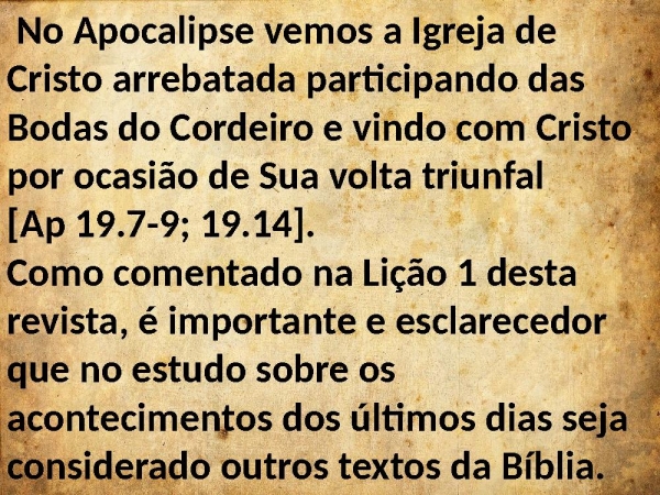 - No Apocalipse vemos a Igreja de Cristo arrebatada participando das Bodas do Cordeiro e vindo com Cristo por ocasião de Sua volta triunfal [Ap 19.7-9; 19.14].Como comentado na Lição 1 desta revista, é importante e esclarecedor que no estudo sobre os acontecimentos dos últimos dias seja considerado outros textos da Bíblia.