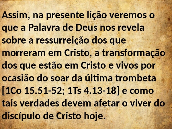 - Assim, na presente lição veremos o que a Palavra de Deus nos revela sobre a ressurreição dos que morreram em Cristo, a transformação dos que estão em Cristo e vivos por ocasião do soar da última trombeta [1Co 15.51-52; 1Ts 4.13-18] e como tais verdades devem afetar o viver do discípulo de Cristo hoje.
