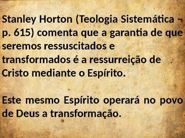 - Stanley Horton (Teologia Sistemática – p. 615) comenta que a garantia de que seremos ressuscitados e transformados é a ressurreição de Cristo mediante o Espírito.Este mesmo Espírito operará no povo de Deus a transformação.