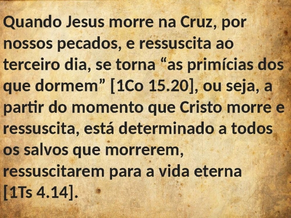 - Quando Jesus morre na Cruz, por nossos pecados, e ressuscita ao terceiro dia, se torna “as primícias dos que dormem” [1Co 15.20], ou seja, a partir do momento que Cristo morre e ressuscita, está determinado a todos os salvos que morrerem, ressuscitarem para a vida eterna [1Ts 4.14].