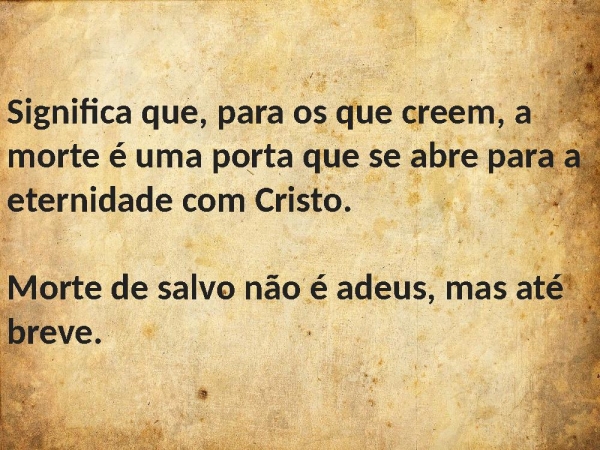 - Significa que, para os que creem, a morte é uma porta que se abre para a eternidade com Cristo.Morte de salvo não é adeus, mas até breve.