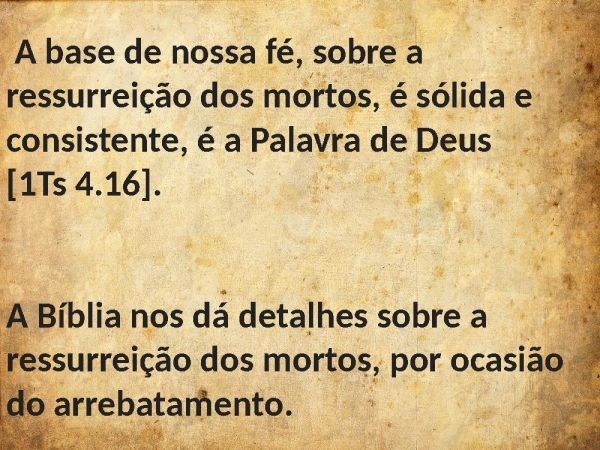- A base de nossa fé, sobre a ressurreição dos mortos, é sólida e consistente, é a Palavra de Deus [1Ts 4.16].A Bíblia nos dá detalhes sobre a ressurreição dos mortos, por ocasião do arrebatamento.