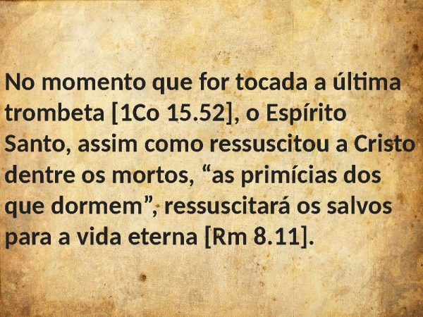 - No momento que for tocada a última trombeta [1Co 15.52], o Espírito Santo, assim como ressuscitou a Cristo dentre os mortos, “as primícias dos que dormem”, ressuscitará os salvos para a vida eterna [Rm 8.11].