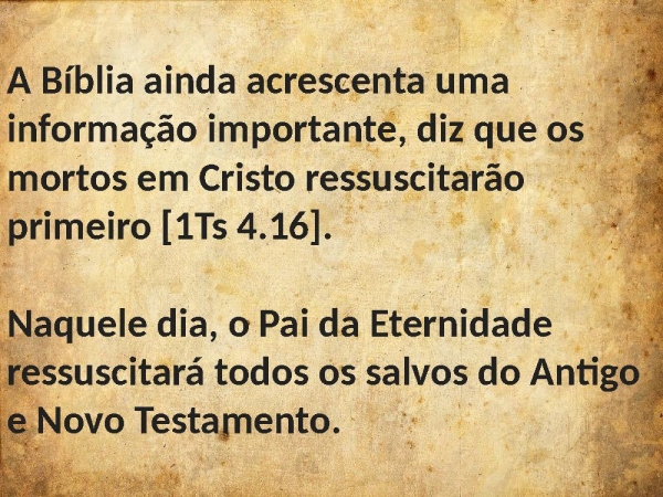 - A Bíblia ainda acrescenta uma informação importante, diz que os mortos em Cristo ressuscitarão primeiro [1Ts 4.16].Naquele dia, o Pai da Eternidade ressuscitará todos os salvos do Antigo e Novo Testamento.