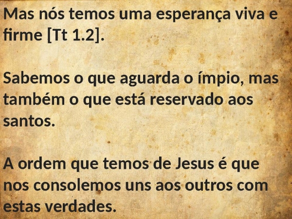 - Mas nós temos uma esperança viva e firme [Tt 1.2]. Sabemos o que aguarda o ímpio, mas também o que está reservado aos santos. A ordem que temos de Jesus é que nos consolemos uns aos outros com estas verdades.