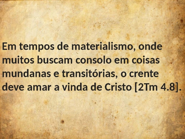 - Em tempos de materialismo, onde muitos buscam consolo em coisas mundanas e transitórias, o crente deve amar a vinda de Cristo [2Tm 4.8].