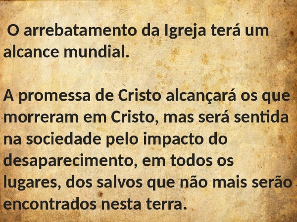 - O arrebatamento da Igreja terá um alcance mundial. A promessa de Cristo alcançará os que morreram em Cristo, mas será sentida na sociedade pelo impacto do desaparecimento, em todos os lugares, dos salvos que não mais serão encontrados nesta terra.