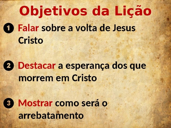 - Objetivos da Lição❶ Falar sobre a volta de Jesus Cristo❷ Destacar a esperança dos que morrem em Cristo❸ Mostrar como será o arrebatamento