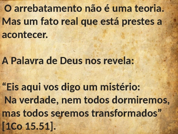 - O arrebatamento não é uma teoria. Mas um fato real que está prestes a acontecer. A Palavra de Deus nos revela: “Eis aqui vos digo um mistério: Na verdade, nem todos dormiremos, mas todos seremos transformados” [1Co 15.51].
