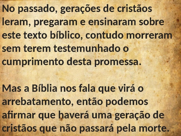 - No passado, gerações de cristãos leram, pregaram e ensinaram sobre este texto bíblico, contudo morreram sem terem testemunhado o cumprimento desta promessa.Mas a Bíblia nos fala que virá o arrebatamento, então podemos afirmar que haverá uma geração de cristãos que não passará pela morte.