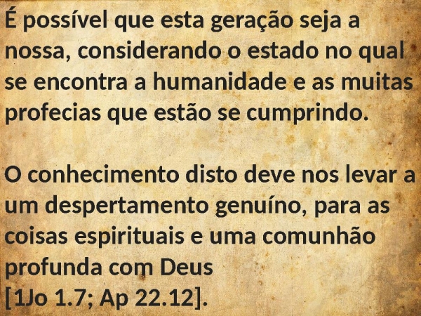 - É possível que esta geração seja a nossa, considerando o estado no qual se encontra a humanidade e as muitas profecias que estão se cumprindo. O conhecimento disto deve nos levar a um despertamento genuíno, para as coisas espirituais e uma comunhão profunda com Deus [1Jo 1.7; Ap 22.12].