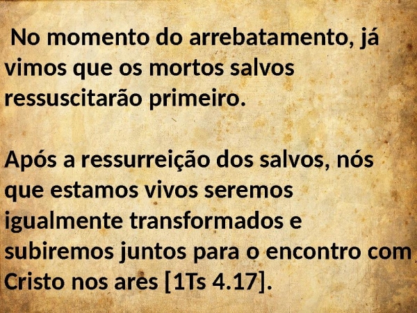 - No momento do arrebatamento, já vimos que os mortos salvos ressuscitarão primeiro. Após a ressurreição dos salvos, nós que estamos vivos seremos igualmente transformados e subiremos juntos para o encontro com Cristo nos ares [1Ts 4.17].