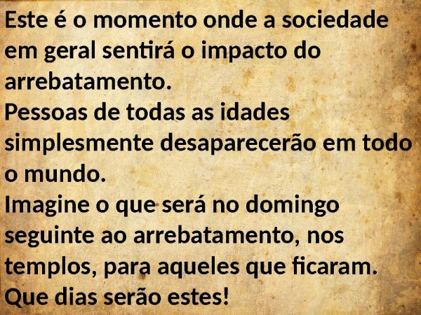 - Este é o momento onde a sociedade em geral sentirá o impacto do arrebatamento.Pessoas de todas as idades simplesmente desaparecerão em todo o mundo.Imagine o que será no domingo seguinte ao arrebatamento, nos templos, para aqueles que ficaram. Que dias serão estes!