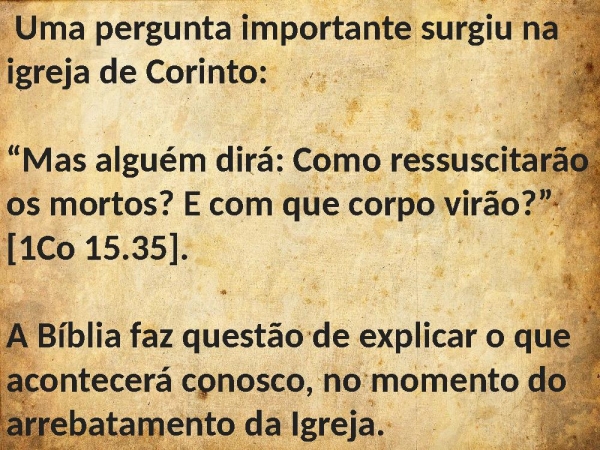 - Uma pergunta importante surgiu na igreja de Corinto: “Mas alguém dirá: Como ressuscitarão os mortos? E com que corpo virão?” [1Co 15.35]. A Bíblia faz questão de explicar o que acontecerá conosco, no momento do arrebatamento da Igreja.
