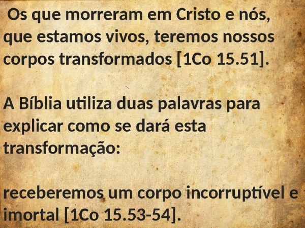 - Os que morreram em Cristo e nós, que estamos vivos, teremos nossos corpos transformados [1Co 15.51]. A Bíblia utiliza duas palavras para explicar como se dará esta transformação: receberemos um corpo incorruptível e imortal [1Co 15.53-54].