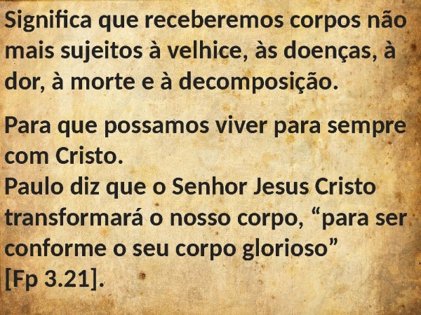 - Significa que receberemos corpos não mais sujeitos à velhice, às doenças, à dor, à morte e à decomposição.Para que possamos viver para sempre com Cristo.Paulo diz que o Senhor Jesus Cristo transformará o nosso corpo, “para ser conforme o seu corpo glorioso” [Fp 3.21].