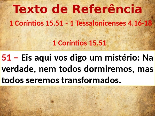 - Texto de Referência 1 Coríntios 15.5151 – Eis aqui vos digo um mistério: Na verdade, nem todos dormiremos, mas todos seremos transformados. - 1 Tessalonicenses 4.16-18 1 Coríntios 15.51