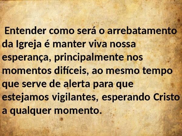 - Entender como será o arrebatamento da Igreja é manter viva nossa esperança, principalmente nos momentos difíceis, ao mesmo tempo que serve de alerta para que estejamos vigilantes, esperando Cristo a qualquer momento.