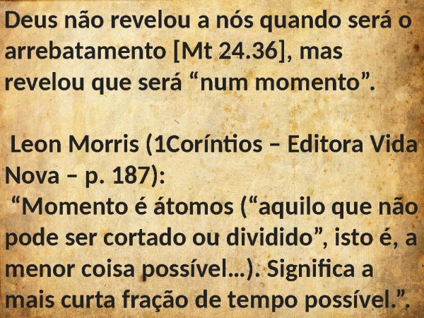 - Deus não revelou a nós quando será o arrebatamento [Mt 24.36], mas revelou que será “num momento”. Leon Morris (1Coríntios – Editora Vida Nova – p. 187): “Momento é átomos (“aquilo que não pode ser cortado ou dividido”, isto é, a menor coisa possível…). Significa a mais curta fração de tempo possível.”.