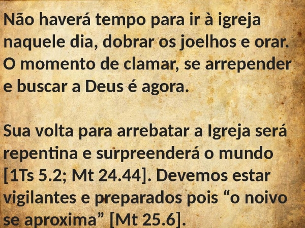 - Não haverá tempo para ir à igreja naquele dia, dobrar os joelhos e orar. O momento de clamar, se arrepender e buscar a Deus é agora.Sua volta para arrebatar a Igreja será repentina e surpreenderá o mundo [1Ts 5.2; Mt 24.44]. Devemos estar vigilantes e preparados pois “o noivo se aproxima” [Mt 25.6].