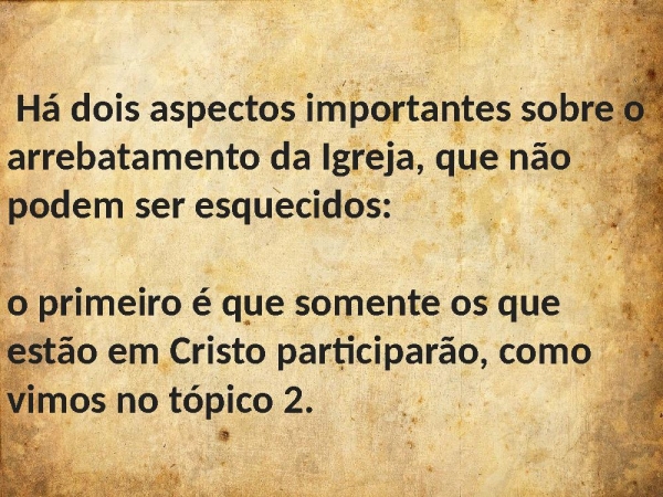 - Há dois aspectos importantes sobre o arrebatamento da Igreja, que não podem ser esquecidos: o primeiro é que somente os que estão em Cristo participarão, como vimos no tópico 2.