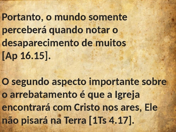- Portanto, o mundo somente perceberá quando notar o desaparecimento de muitos [Ap 16.15]. O segundo aspecto importante sobre o arrebatamento é que a Igreja encontrará com Cristo nos ares, Ele não pisará na Terra [1Ts 4.17].